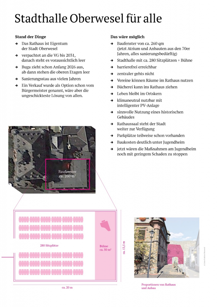 Jetzt können die unsicheren Planungen für das Jugendheim noch gestoppt werden, ohne dass große Kosten entstanden sind. »Eine »Stadthalle für alle« in Holzbauweise dürfte sicher nur einen Teil von dem Jugendheimbudget kosten. Und wir können so das Leben im Kern von Oberwesel halten!« so Büning, Die »Stadthalle für alle« wäre auf natürliche Weise das neue Zentrum von Oberwesel und würde viele städtebauliche Fragen auflösen.«