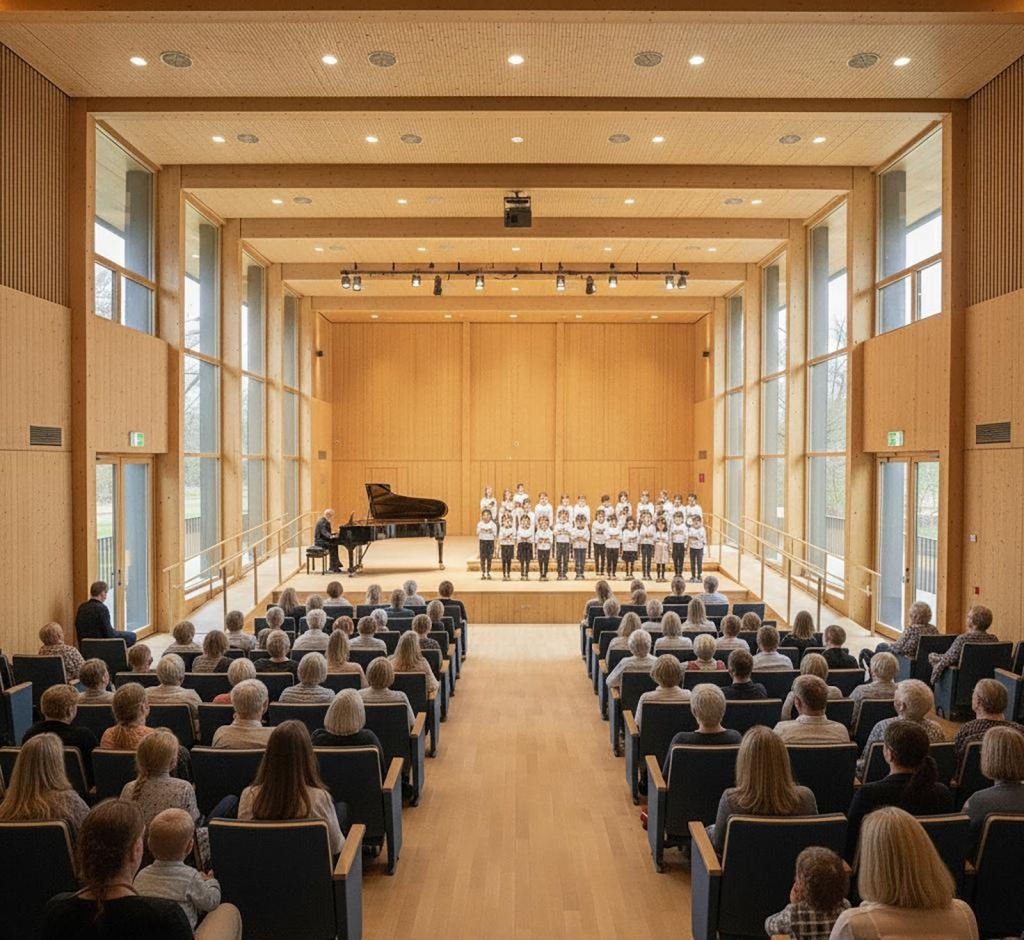 Eine KI-generierte Darstellung, wie die Stadthalle für alle in Holzbauweise aussehen könnte.