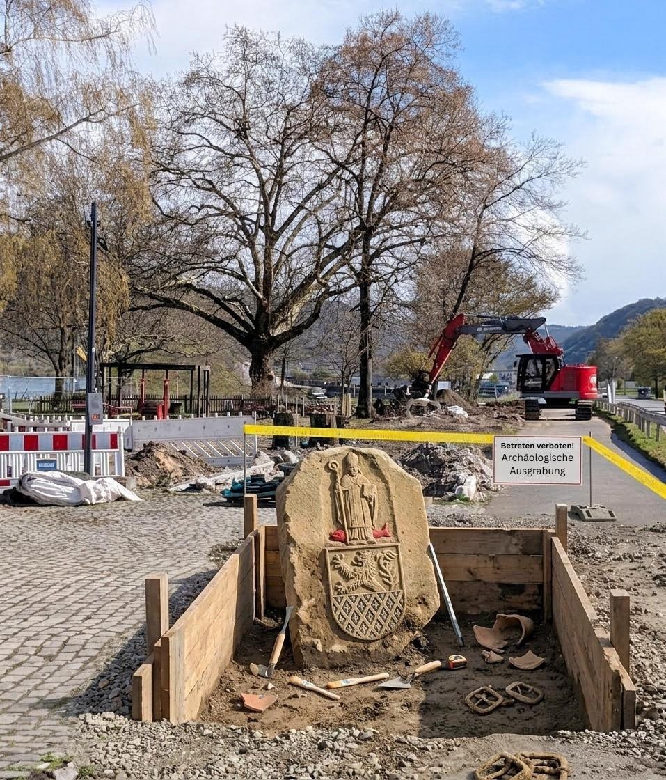 Hinzu kommt eine teilweise freigelegte Steinplatte mit einer schwer lesbaren Inschrift, die derzeit von Fachleuten untersucht wird. Erste Hinweise aus dem Umfeld der Untersuchungen sorgen jedoch bereits für Aufmerksamkeit: Demnach könnten die Funde nicht – wie zunächst angenommen – Oberwesel zuzuordnen sein, sondern ausgerechnet auf eine frühe Besiedlung durch Bewohner aus St. Goar hindeuten.